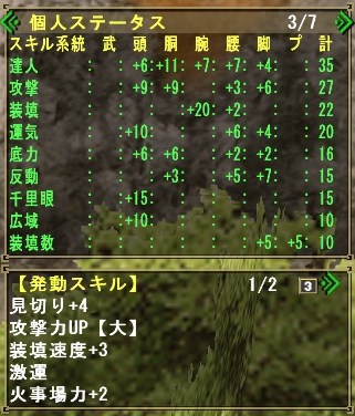 見切り+4,攻撃力UP【大】,装填速度+3,激運,火事場力+2